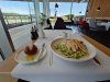 Jeg beholdt rommet i nesten fire timer. Litt usikker på om jeg faktisk sovnet på et tidspunkt - om ikke annet ble det en god hvil etterfulgt av en dusj og litt surfing og flere jobbmailer. Nå er det lunsj i restaurangen! Jeg rakk ikke å ta bilde av menyen før den forsvant, men det var nok av alternativer å velge mellom. Jeg gikk for en Cæsar-salat og et glass bobler. Ellers er det ganske stille i loungen akkurat nå, det er vel midt i mellom rushet mot vest og mot øst.